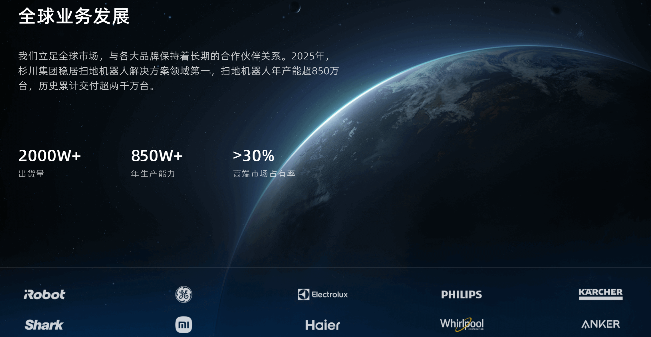 杉川官网显示,这家成立于2016年的公司主营业务之一是扫地机器人解决方案。除了iRobot,官网列出的合作伙伴还有飞利浦、小米、海尔、惠而浦(600983)、安克等。2025年,杉川稳居扫地机器人解决方案领域第一,扫地机器人年产能超850万台。